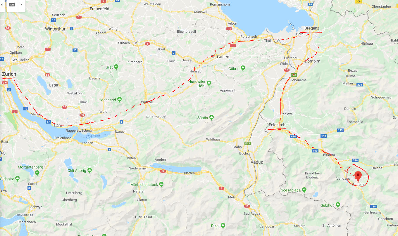 Schruns sijaitsee läntisessä osassa Itävaltaa ja otimme lennot poikkeuksellisesti Zurichiin, josta pääsee junalla Bregenziin ja sieltä bussille eteenpäin. Junalippuja ei tuolloin Sveitsin rautateiden sivuilta pystynyt ostamaan kansainvälisille reiteille, joten oli mentävä lentoaseman yhteydessä olevan juna-aseman lipputiskille, josta liput sai. Junamatka bregenziin maksoi yht kahdelta hengeltä noin 80 frangia ja junat olivat hyviä. Vaihtoja oli St Gallenissa ja St Margeritassa ennen Bregensiä. Ostimme sieltä uudet liput Schrunsiin ja ne maksoi 23€ yht. Junamatka Bregenzistä Schrunsiin kesti 1:40 ja Zurichihin lentoasemalta Bregenziin vähän alle kolme tuntia.