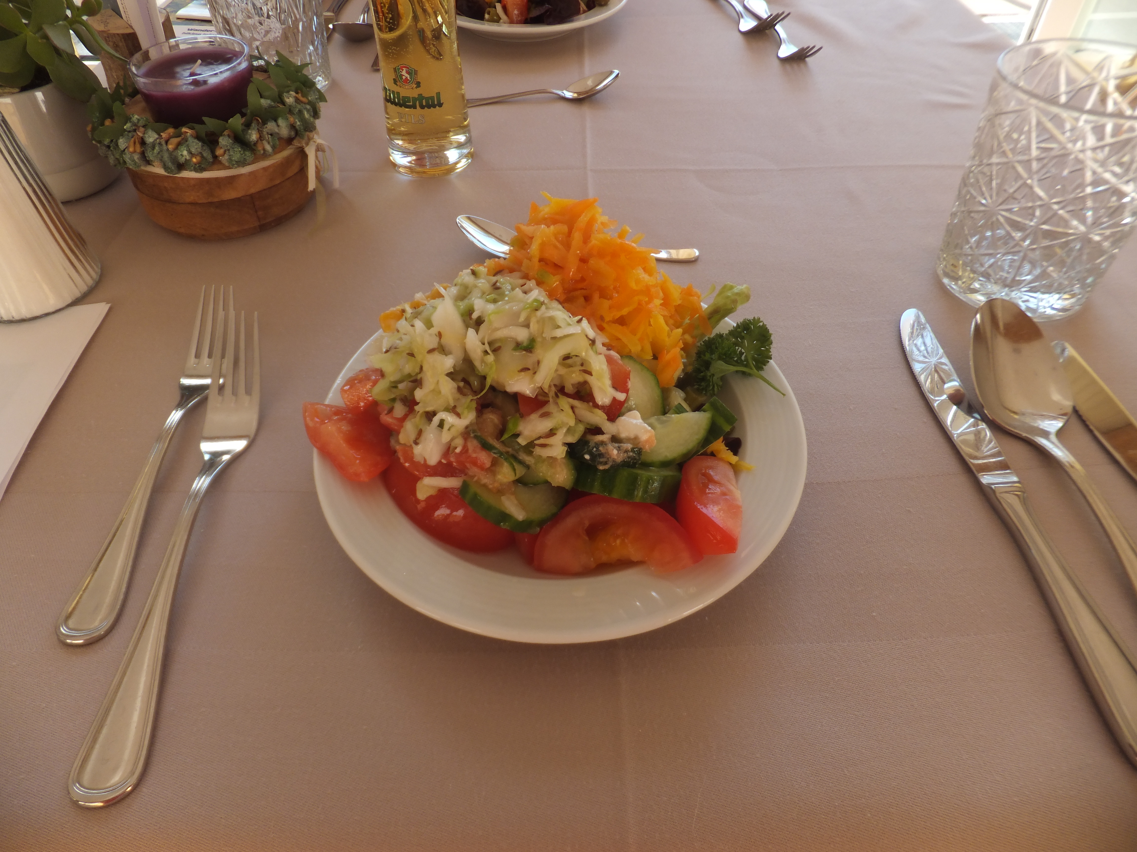 Majoittauduimme oikein kivassa hotellissa Hotel Heigenhauserissa. Hotellissa oli kivat huoneet, suomalainen sauna sekä ulkouima-allas, jonka vesi tuli lähteestä. Hotellin aamiainen oli loistava, erityisesti pienet jyväisät sämpylät olivat ihan loistavat. Aamiaisella oli kaikki tarvittava jopa joka aamu kuohuviiniä. Iltaruoka oli myös todella hyvä. Salaattibuffetti, alkukeitto, pääruoka (2 vaihtoehtoa, liha ja kala/kasvis) sekä jälkiruoka. Hotellissa ei ollut päiväpälaa, joka oli hyvä, koska patikat kestivät niin kauan, ettei olisi ehtinyt niitä syömäänkään. Palvelu oli mainiota.
