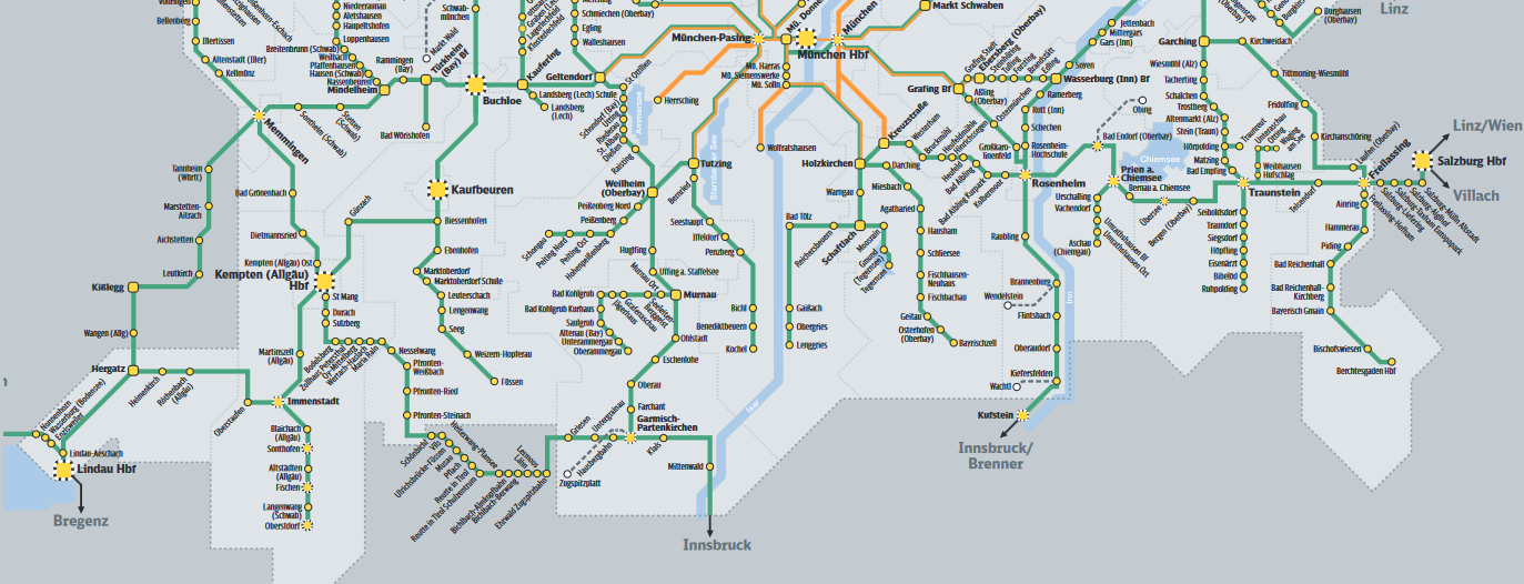 Useimmiten olemme menneet Tirolin alueelle, mutta olemme menneet myös Vorarlbergiin, jonka reitti kuvataan erillisessa postauksessa. Lisäksi kerran menimme läntiseen Itävaltaan (Montafon Brandental Bregenzerwaldissa) ja lensimme Zurichiin, josta menimme junalla Itävallan kohteeseen. Kerran menimme Salzburgerlandiin ja paluujunamatka meni Kufsteinin sijaan Salzburgin kautta. Saksan Bavaria Ticket ei kelpaa Salzburgiin saakka, joten kartasta on hyvä katsoa, mistä lähtien on oltava Itävallan lippu. Tästä ollaan aika tarkkana.